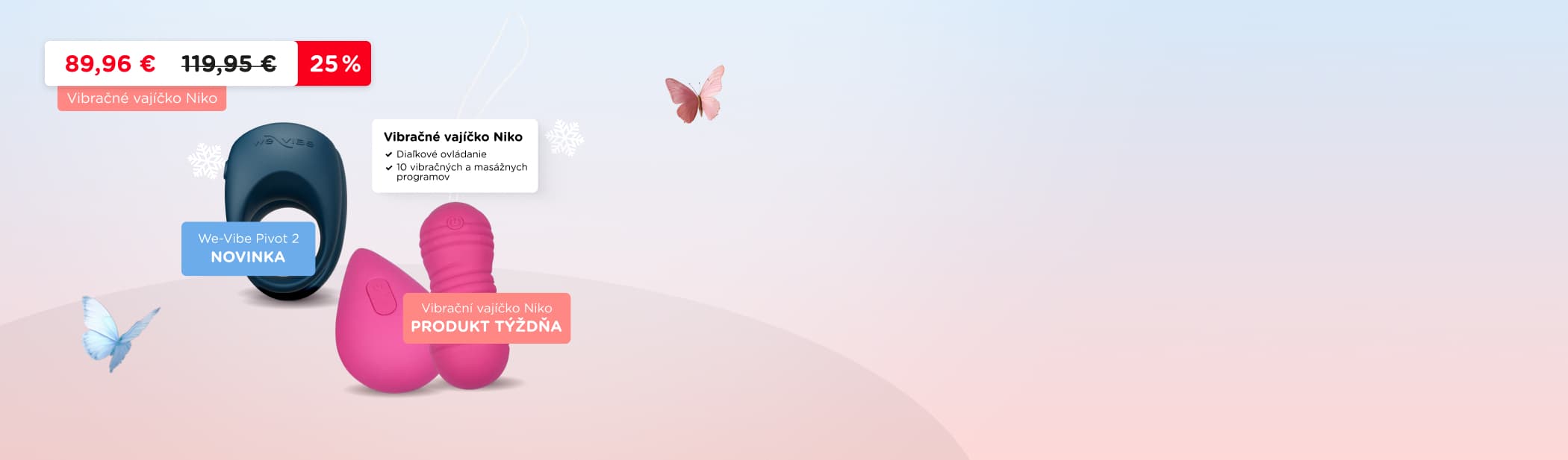 Máme pre vás skvelú novinku a produkt týždňa so zľavou 25%: Vibračné vajíčko Niko pre párové hrátky s diaľkovým ovládaním! Plus super novinka: Vibračný krúžok Pivot 2, pre zdieľané potešenie a spoločný orgazmus.